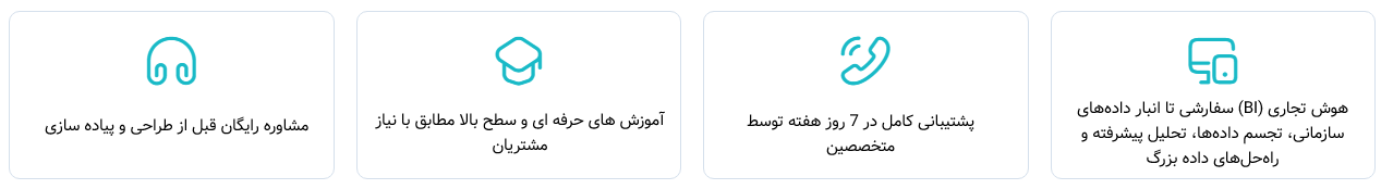 - خدمات جامع مدیریت داده: از هوش تجاری (BI) سفارشی تا انبار دادههای سازمانی، تجسم دادهها، تحلیل پیشرفته و راهحلهای داده بزرگ.